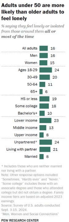 - Pew Research shows the demographics of loneliness; these three factors contribute to a person nbeing loneliness: