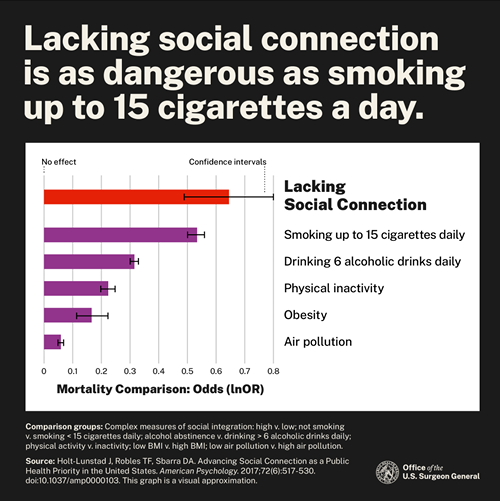 "Our Epidemic of Loneliness and Isolation" states that a lack of social connection is as deterimental to health as smoking 15 cigarettes a day. - Looking at the graph, we can se that drinking SIX alcoholic drinks per day is healthier than lacking social connections.